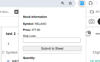 PT Bot은 TradingView를 사용하는 트레이더를 위해 설계된 무료 Chrome 추가 기능입니다. 이 도구는 TradingView에서 직접 거래 데이터를 효율적으로 캡처하여 거래 관리 프로세스를 간소화합니다. 캡처된 데이터를 개인 위험 관리 시트로 전송하여 거래 성과를 추적하고 분석하기 쉽게 만듭니다. 또한, Kite에서 주문을 미리 채우는 데 도움을 주어 전반적인 거래 워크플로를 향상시킵니다.